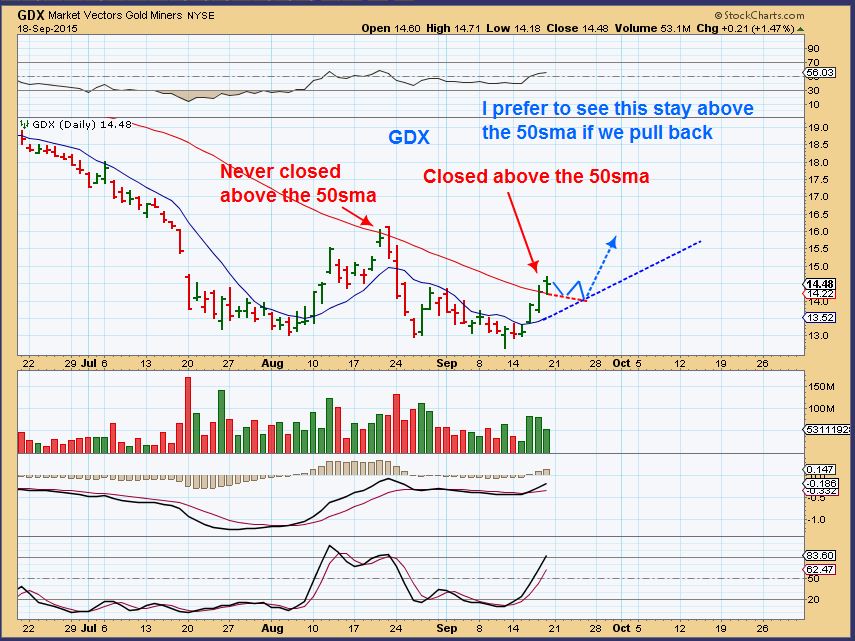 GDX – If we get a pullback to the 10sma, I would actually like to see if be a mild one riding above the 50sma. This would show strength I.M.H.O.