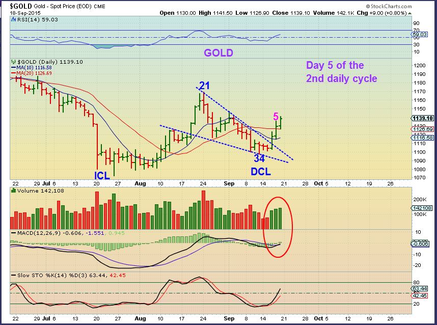 GOLD Sept 18 – We should be on day 5 of the 2nd daily cycle. The first was right Translated, which means that this one should break above the first daily cycles highs neat $1170.