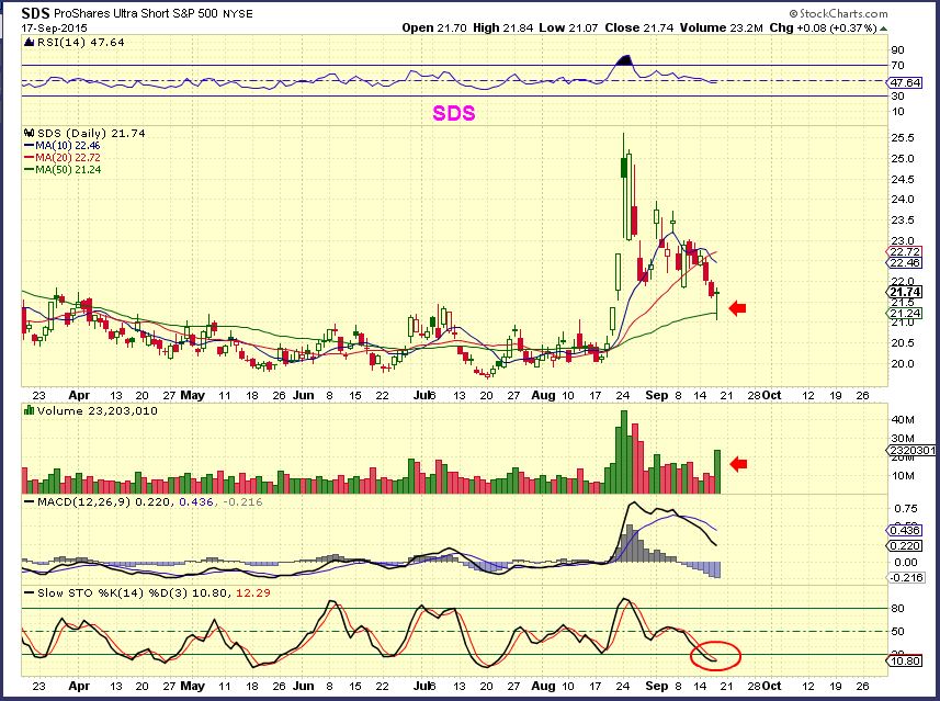 SDS ( See also TZA, QID, SOXS, ETC for possible ‘short’ trade ideas) This was after Thursday. If the Markets are testing the lows, these will test near the highs.