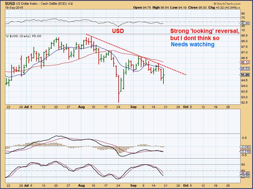 VIX – This is the Vix currently. It dropped and reversed as the markets turned down Friday. If the vix rises , the markets drop, so this can be viewed as a ‘short’ signal on a break out .