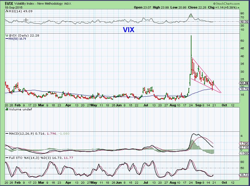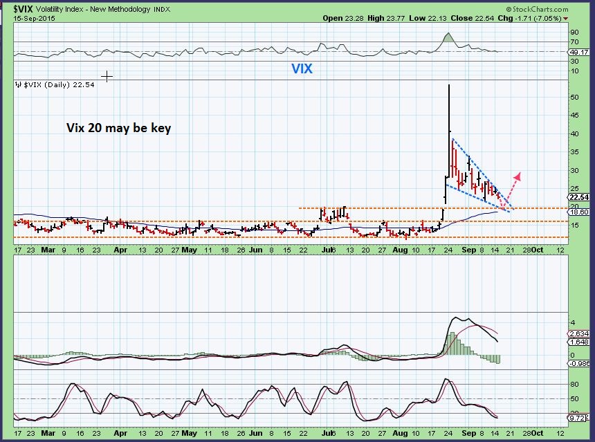 Shorter term, I was watching for the VIX to drop to support. This was the VIX on Sept 15 , the Tuesday before the FED RELEASE. It had time to drop as the markets rose going into the Fed Mtg.