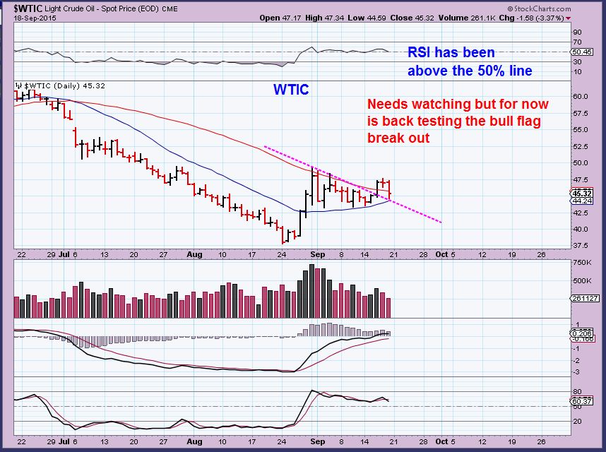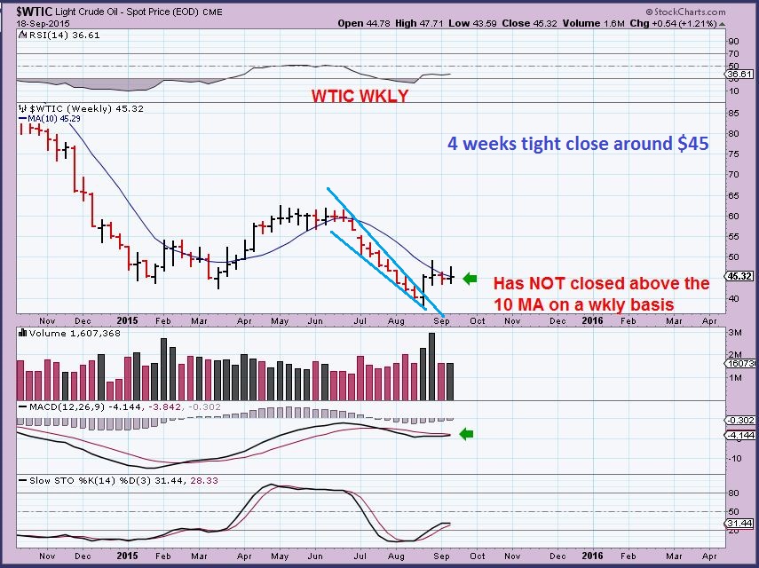 WTIC – Oils weekly chart has not closed above the 10 MA , but price may be coiling or consolidating do do so.
