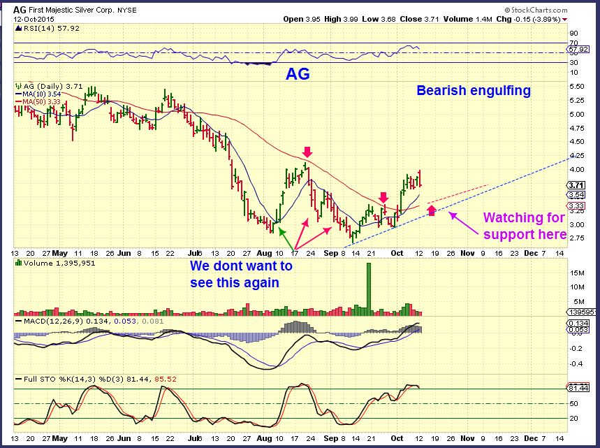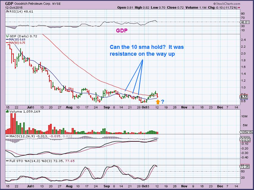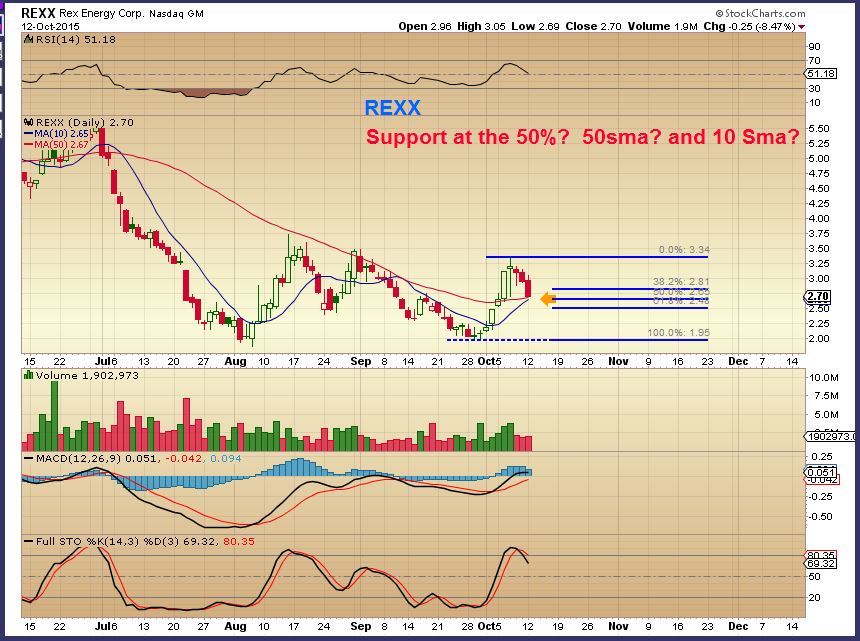 So you can see that we may be at a critical point. I expected a bit more upside in many areas, but Bearish Engulfing Candles ( with the dollar down) must be noted and watched. To close this report I am just going to post several random Energy or Miners charts and show how I would watch the pullback. I am looking at areas of possible support to see if they hold up, or will we get another prolonged drop. In other words, we may be heading for some buying opportunities or we may see break downs. The following charts will show you what I look for.