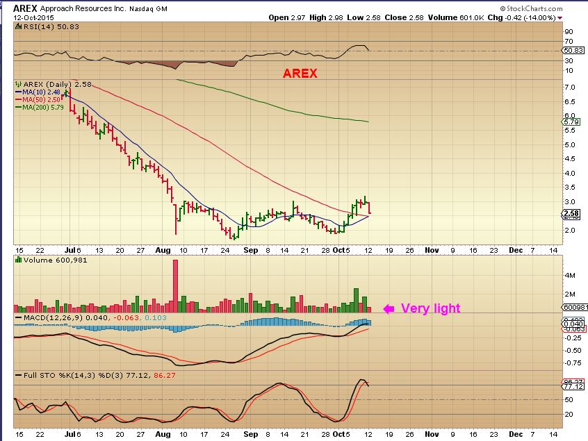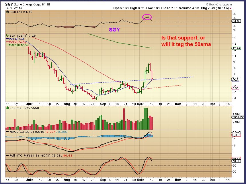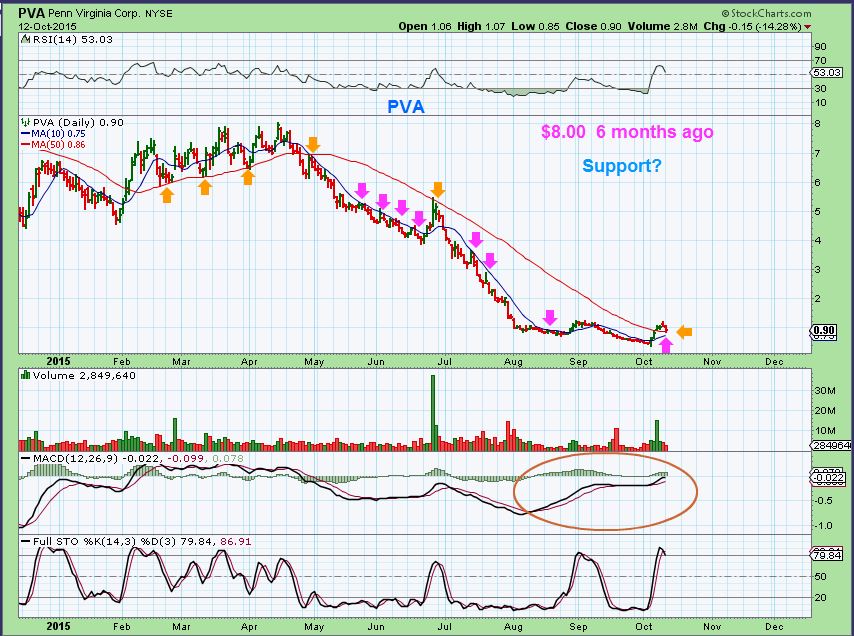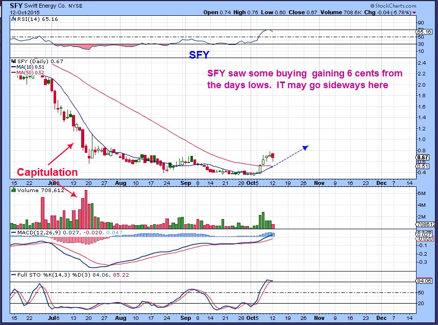 I’m looking at some of the above stocks and recall myself saying, ” I wish I had taken a position in that little rocket ship.” Think about WG, CRK, SA, maybe even KEG & SFY. So if we pull back lightly and reverse on support we may be getting a higher low and a low risk entry. We can buy near support and put a stop closely underneath. If we plunge down through support, obviously something else is going on here and we need to be patient and keep evaluating. So I am NOT saying that the buy is Tuesday. Be patient, often these pullbacks can take their time & just bounce around support too. Look at NG or SA with the 50sma , for example. They may be waiting for the next DCL before taking off higher.
