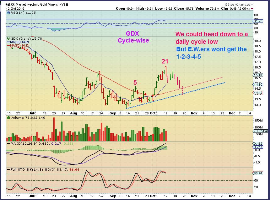 Alex, I hope you’ll take a look at the miners Tonight. I see GDX rolling over on the 4hr chart and shorter time frames. Divergence on MACD and RSI don’t look positive. I could see a draw down to $15 possible, that would be a 38.2% retrace. Looking for your thoughts.