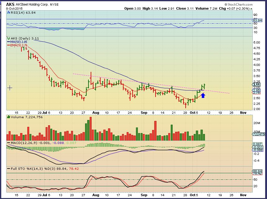 I pointed out AKS Wednesday. It improved a bit more today, above the 50sma and breaking from its base.