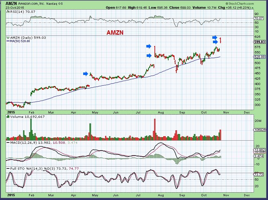 AMZN –  It often Gaps  open from Earnings and stalls or drops. It put in a reversal Friday similar to July.