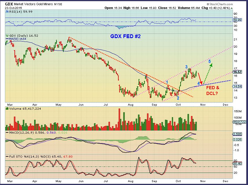 GDX  FED IDEA #1 –  Rise into the Fed Mtg and drop to the 50sma , 1-2-3-4-5 ? Increasing volume from Thursday to Friday.
