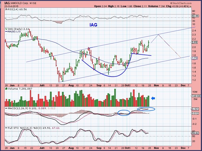 I posted Bullish looking charts of AUY, IAG, SA and EGO Friday a.m. to show why I think Miners look like they want to go higher.  They all improved.  This was IAG Thursday for example, and Friday .