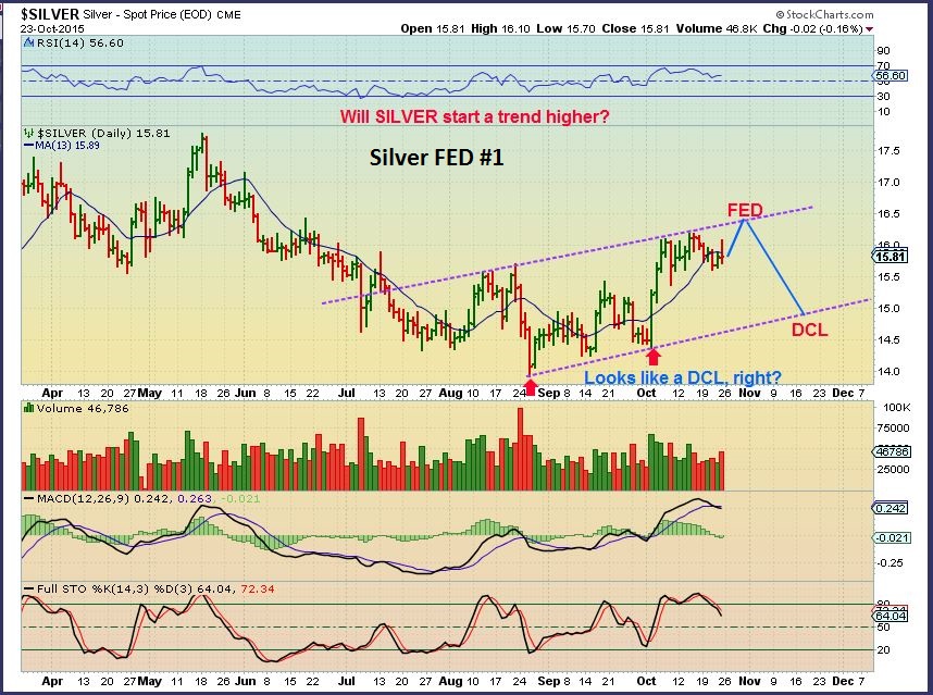 SILVER  FED idea #1  –   OCT 2 looks like a DCL.  This puts us ready to fall into a dcl later this week. The chart shows what I feel we could see if we rise into the Fed Wednesday.  Keep in mind that this early in a daily cycle ( day 16),  we could fly through the Fed Mtg and run up higher to day 25.  WHY? The First dily cycle for Silver out of its lows was not really long, so the next one could be.  If it runs for 33 days and we are on day 16, it is only 1/2 over  🙂
