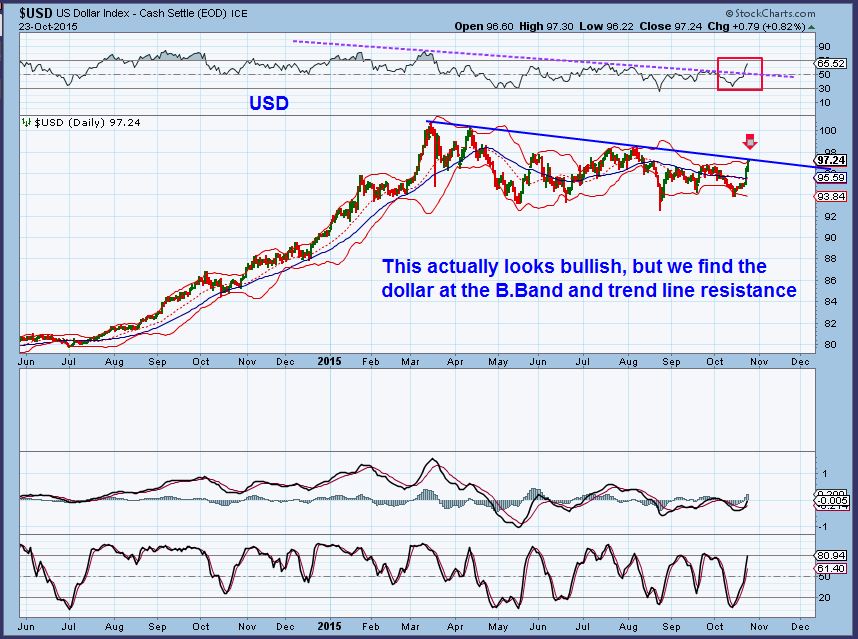 USD DAILY –  The daily is up against the Bollinger Band & Resistance, but that doesnt have to stop it from moving higher.