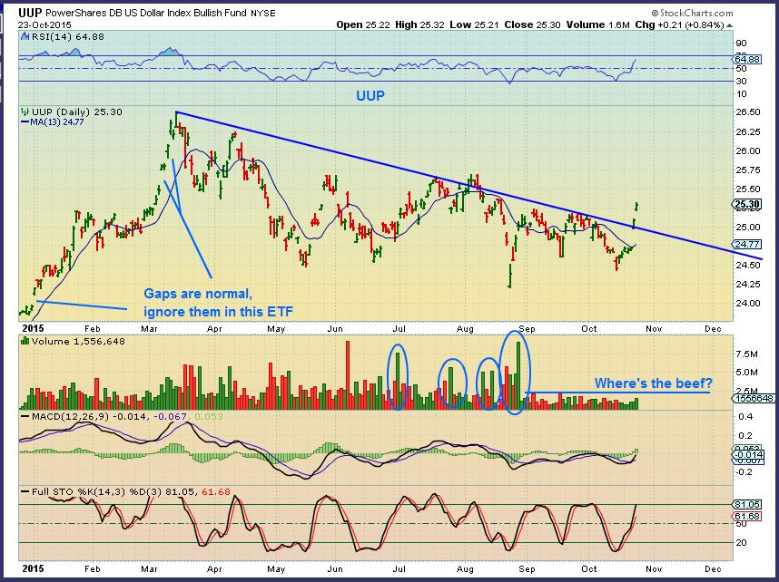 UUP  –  I thought that the USD ETF   showed a strong move without strong volume,  so I wanted to point that out. It may be a false sign of strength.  The UUP tracks a bit off, so it shows a break out where the USD doesnt. Again, I’m wondering, “Is the Dollar going to roll over at the Fed Mtg Wednesday?”.
