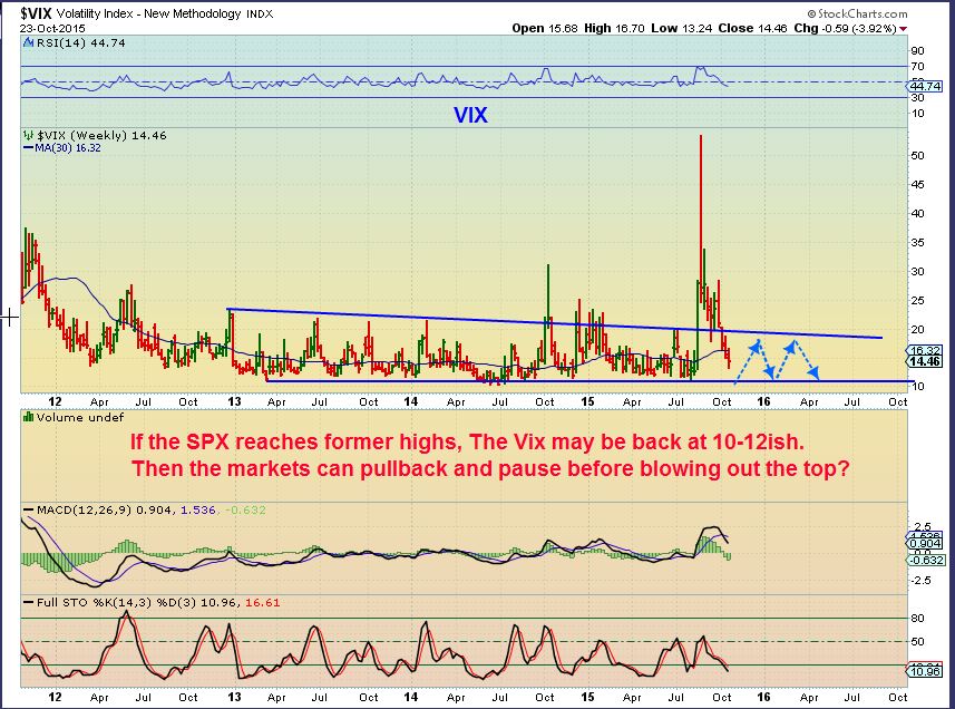 So if we bounce around here ,  the VIX may bottom as the markets top . If the Markets back test and drop, the Vix will likely put in another huge spike –  see the Spike in Oct 2014, July 2015, and picture another huge one not drawn in.