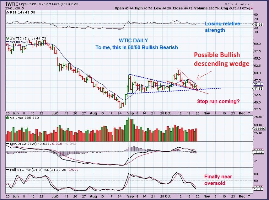 WTIC – DAY 43.  That is getting late for a DCL.    It “appears” weak and volume seemed a tad heavy on the selling days, but a low is due . I’m pointing out a bullish falling wedge in red.  Maybe a stop run / false break down and reversal higher?  Again, The XLE & many Energy stocks look pretty good, I expect OIL to break higher soon.