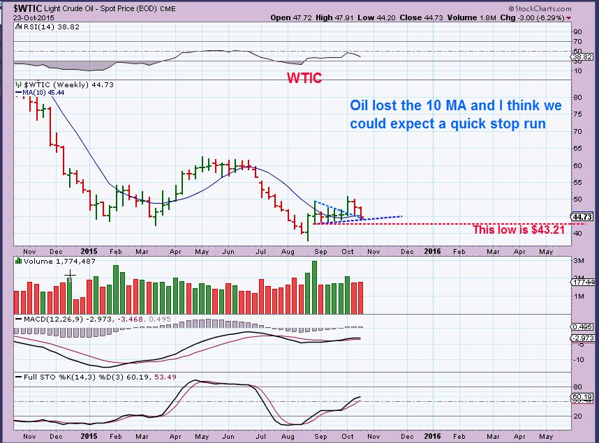 WTIC WKLY –  Losing the 10MA on a wkly basis is not what you want to see. I’d like OIL to be higher this week to re-gain it .