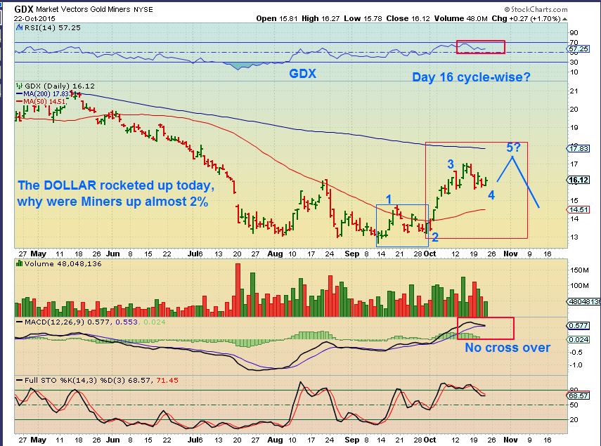GDX Currently – Will we get that one more Pop? It was up almost 2% with the dollar rocket. This looks like it is on a 2nd daily cycle, but can it really be so different from Gold?