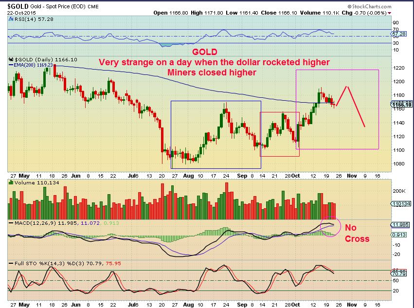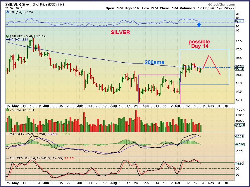 SILVER– Silver closed GREEN with the USD rocketing higher. How can I explain that? I have to assume that there is strength building at these 3 yr lows and maybe we really are seeing a change of character. I would picture a break above the 200sma and then many Gold Bulls would jump in – it could then roll over. A sucker type move possibly? ( This is all guess work from here friends, I truly was amazed at the USD rocket so much in 1 day and see the Precious Metals standing strong).