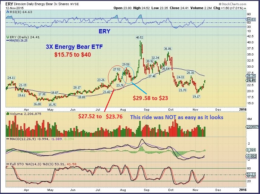 SCO & ERY are shown below. SCO went from $52 to $137 during the last Oil sell off. Even if you only caught the middle of that move , it was rewarding.