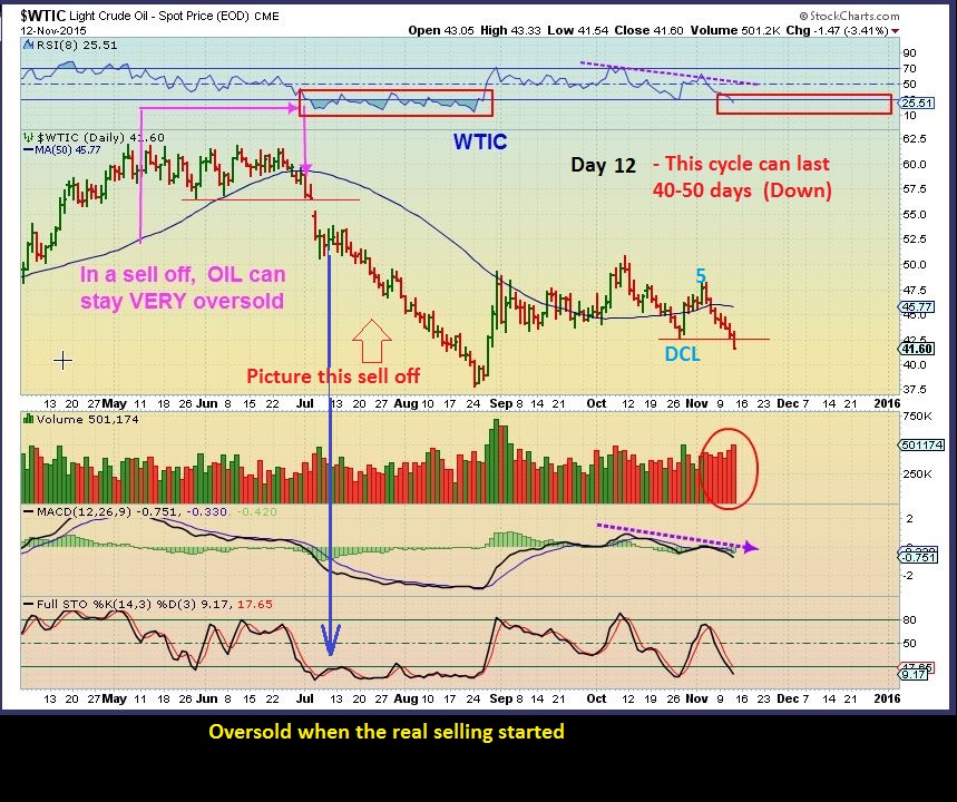 WTIC – Nov 11 this was our picture of OIL. Please note the $42.58 . Oil was not acting the way that it should early in a 2nd daily cycle and the high volume selling was noteworthy.