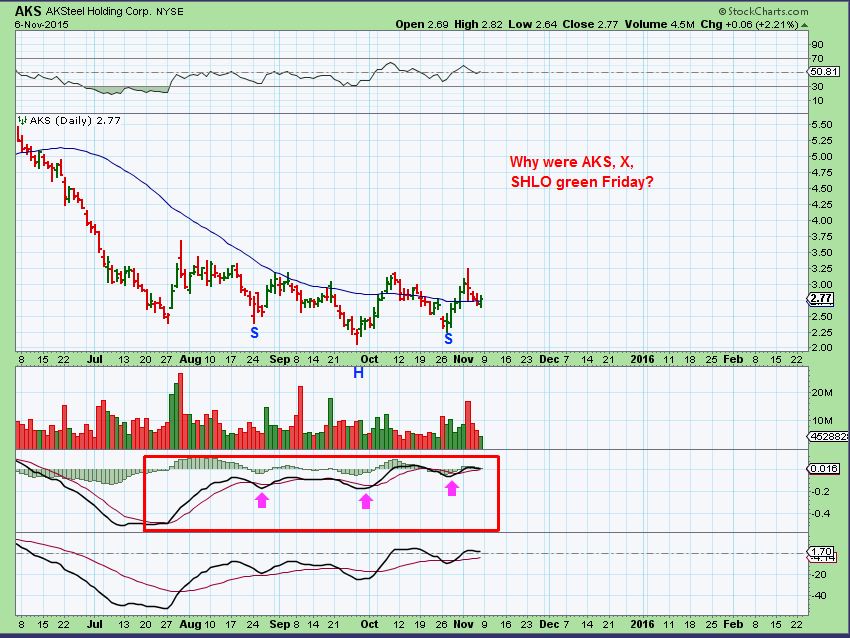 AKS, X, SHLO, SCHN, AA, CENX, etc and other commodity stocks closed higher Friday with the dollar surge. Interesting mixture. Maybe they feel that if the economy does well, these will too?