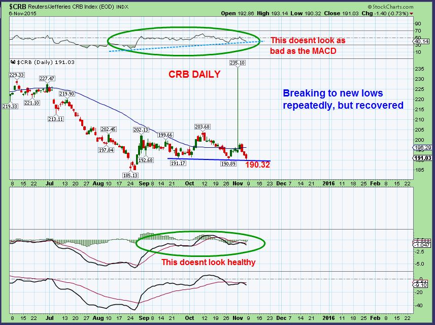 CRB DAILY – The CRB has been breaking to new slightly lows each month and then reversing higher. The MACD isnt healthy at this point, the RSI is ok. This could easily be forming a H&S with the Dollar strength so we need more time.