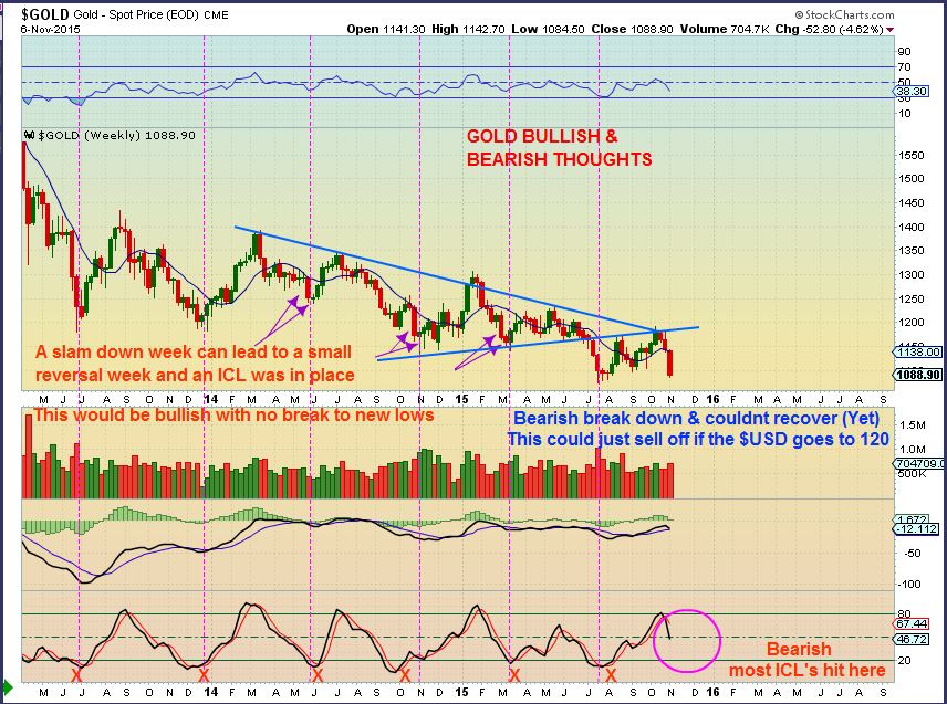 GOLD WEEKLY – This would be a way to foresee a Bullish or Bearish view . We have seen a slam down week followed by a doji or small price range the next week. This could keep us from breaking the summer lows and we could turn higher between now & next week. Bearish note is that Stochastics MAY need to drop further and Gold broke down from a triangle and cannot recover ( Blue lines).
