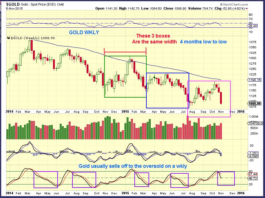 GOLD WEEKLY – This would lean toward a bearish view. I just wanted to “Box” the time frame that we have recently seen lows fall into . Notice that the stochastics usually sells down below 20 on the weekly. Gold sold off so fast this week, that the stochastics is still high, leaving room for more downside. This could be a bad sign if Golds weekly needs to drop that far. IT has in the Bear Market Rally, but would it in a bottoming process? We’ll see.