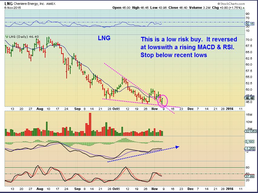 LNG – New buy opportunity. Earnings came out Friday morning and it put in a reversal at the lows.