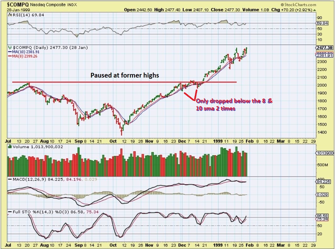 Lets zoom in, the pause as it reached former highs is pointed out, and we are there now too ( approaching former highs). So here it did not drop & close below the 8 & 10sma for more than a day. We should watch for that kind of strength.