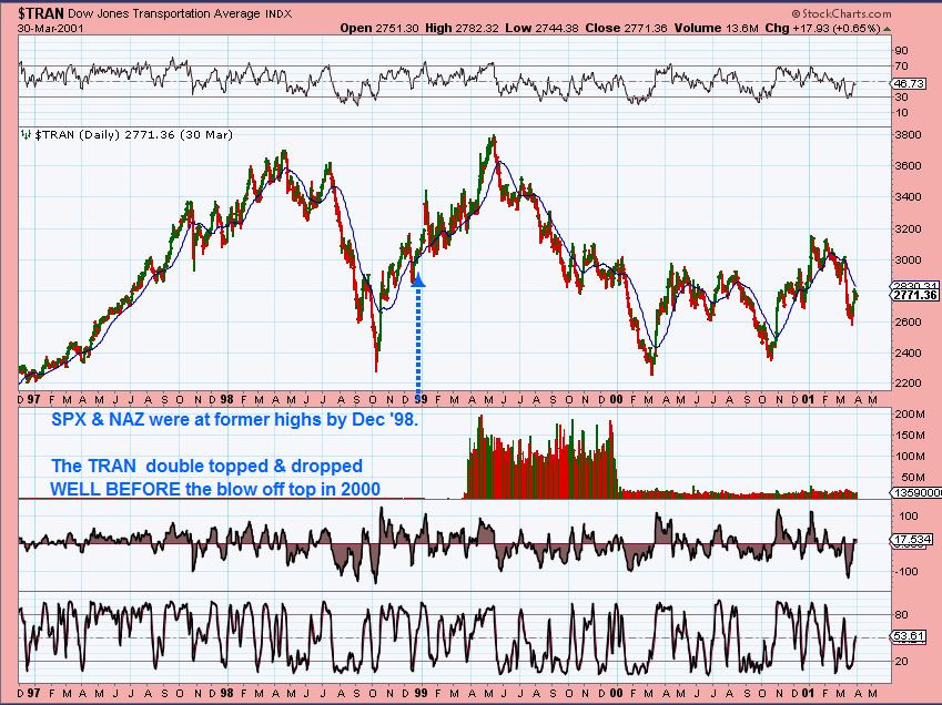 The TRAN was lagging then too. When the NAS was at former highs in Dec 1998, the TRAN did not recover yet. When the NAZ went parabolic 1999 into 2000, the TRAN actually double topped & fell apart. THAT is important divergence to take note of if you ask me. It didnt matter that the TRAN was lagging.