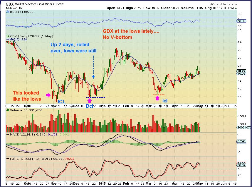 Sure, GDX could drop and put in another low, bottoms are never easy. Please use & honer stops. The lows are really for experienced traders, and stops will protect you from large losses. GDX lows have NOT been V-Bottoms lately, so this bumpy action is nothing new. What looked to be the NOV 2014 lows broke to new lows 1 more time. Could we do that here?? Yes. The Dec lows surged higher for 2 days and dropped just like this recent low. The March ICL went sideways for 1 whole week. No V-Bottoms at those lows, so why expect one now?
