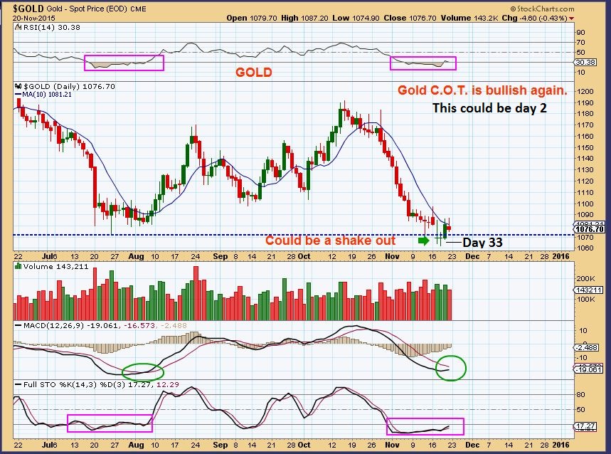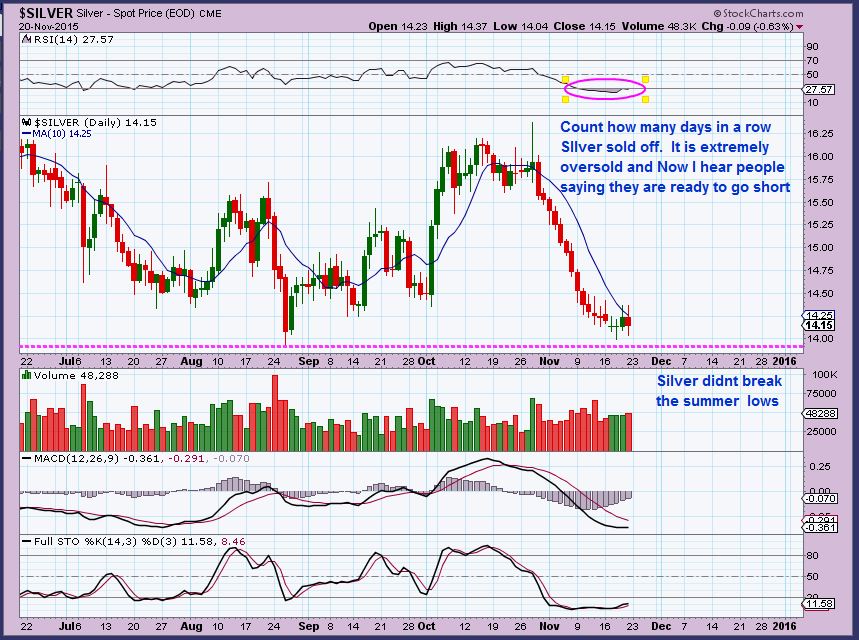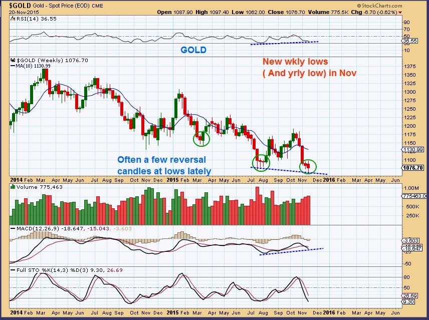 GOLD WKLY – We had 2 reversal type candles at recent lows. Notice that July had 3 weeks of reversal candles, it gets bumpy down here. Last weeks was the lowest low. In November of 2014, we had a yrly low for Gold. We may have the yrly low for Gold in Nov 2015 too.