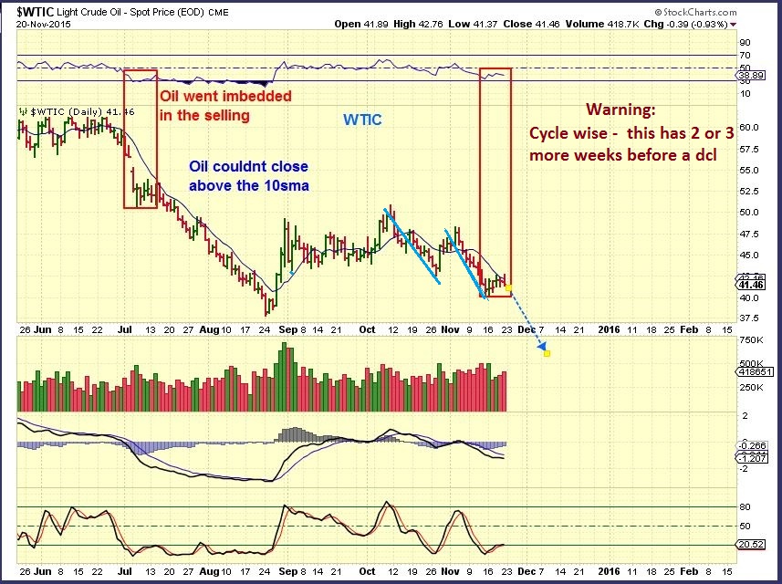 On NOV 12 OIL FAILED at $42.50 early in the daily cycle. It was VERY EARLY, since Oils daily cycles can go on for 40 to 50 days! This chart shows that NOV 13 there was follow through downside. I called for a stairway down going forward.