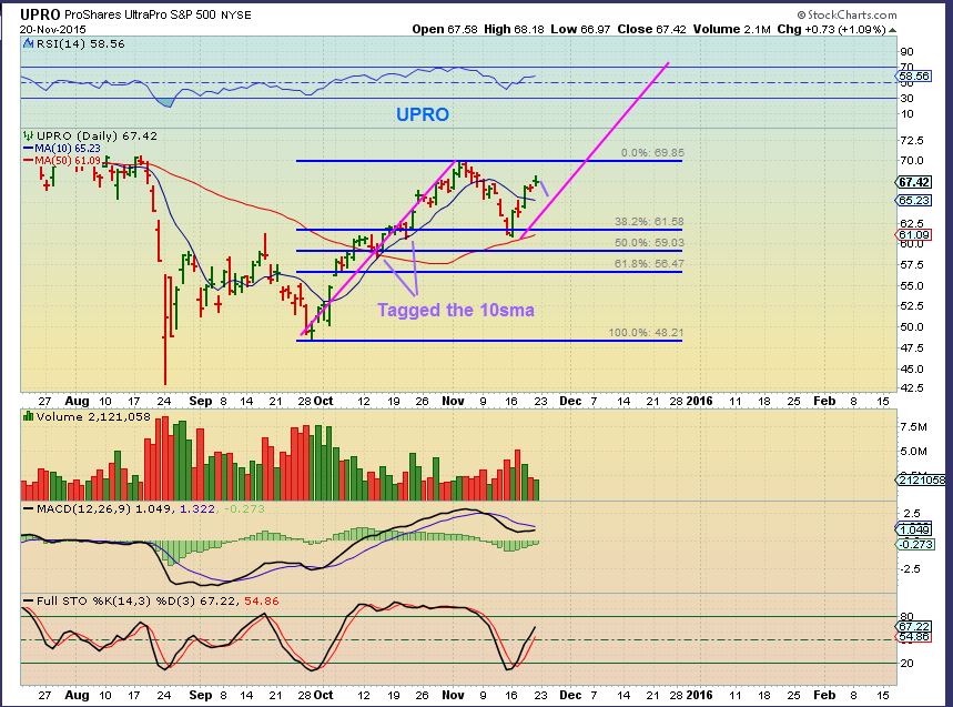UPRO ( or TQQQ for NAZ) is a slightly leveraged ETF for the SPX . On the last run higher, it tagged the 10sma a few times. I would buy it at a tag of the 10sma or take a position and use the 10sma as an area to put a stop under. As a trader: When I look at this chart ( or TQQQ) I think that the MACD is saying to wait for a pullback to the 10sma.