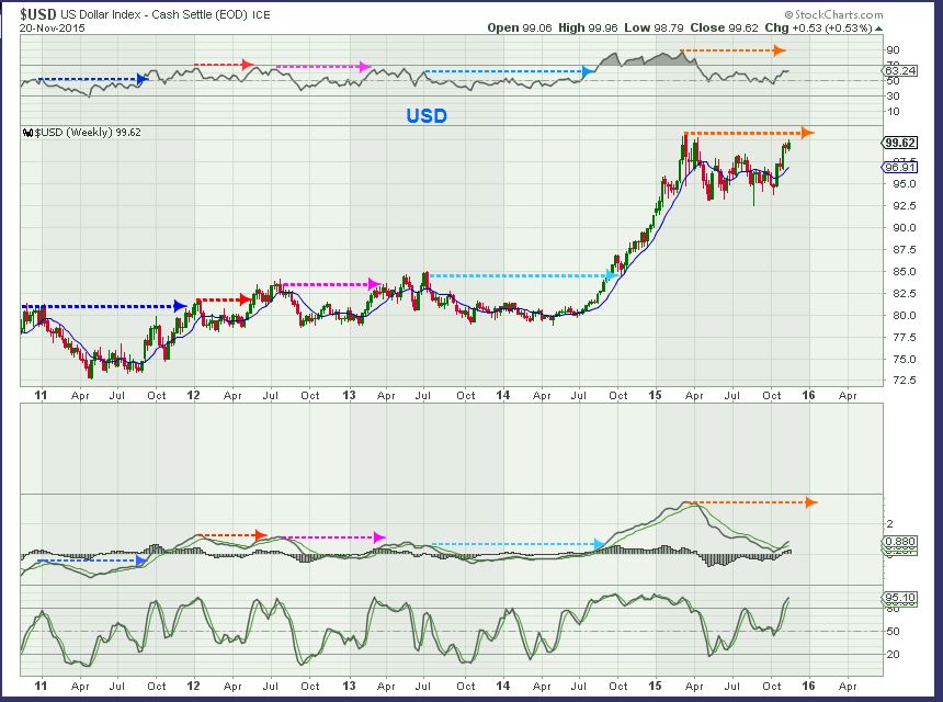 I look at the USD WKLY like this. The MACD has reset and can move a lot higher again, but after consolidations in the past , when prior highs were reached the dollar often paused & dropped. It matches cycle timing.
