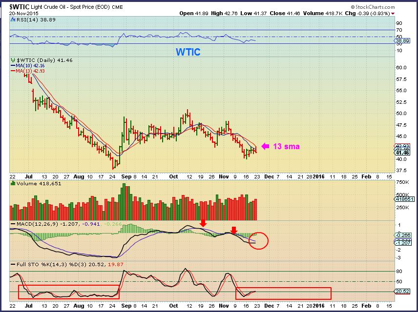 WTIC — Price only went sideways was rejected at the 13 sma Friday. Oil may bounce around sideways, but I expect it to drop lower, not run higher.