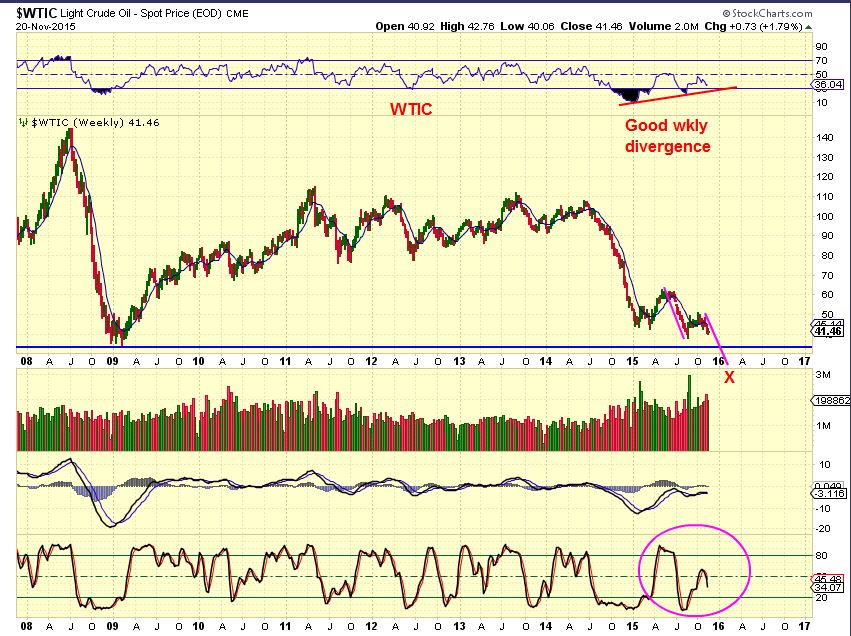 WTIC WKLY – The current view shows a stochastics with plenty of room to drop if this gets going. Divergence indicates that the next low could be THE LOWS. Some energy stocks are being accumulated despite the drop as further evidence of this.
