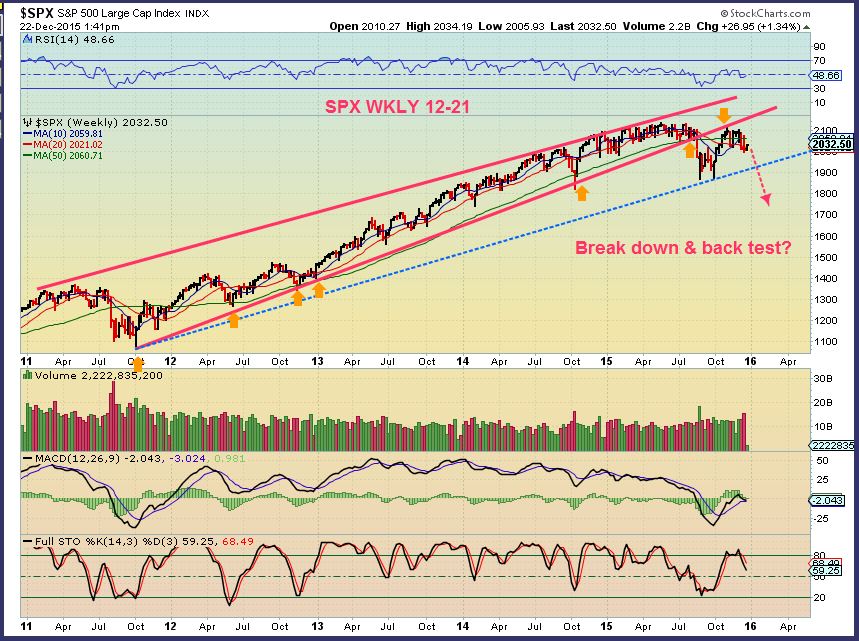SPX WKLY – There is a blue channel line that may provide hope of an uptrend. A break of that shows us that this was a ( Red Lines) Bearish wedge , break down and back test ( Orange Arrows) .
