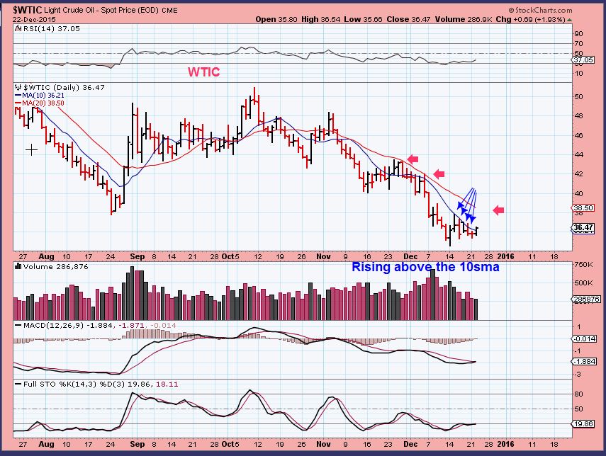 WTIC – I’ve been expecting that a Daily Cycle Low could form in this area. The 10 sma has held price down, but we closed above it Tuesday. Now that 20sma should be the next challenge and may identify whether this is an ICL or a DCL. I think OIL will move higher from here, but watch the action around that 20sma. If we dont just go sideways, we may get a MACD cross for the first time in many weeks.