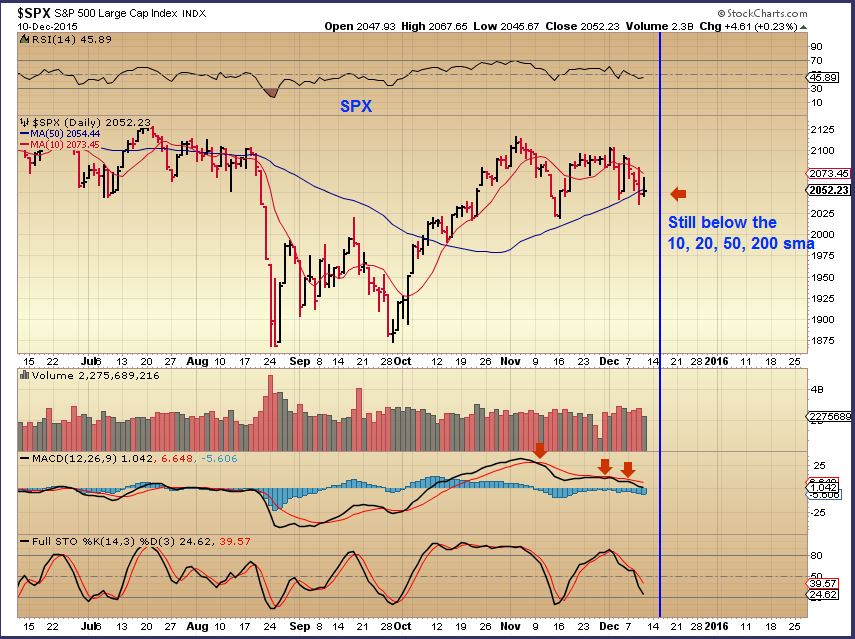 SPX – I believe that I mentioned yesterday that with the weakness that I was seeing in the markets, it would be hard to recommend any bullish trade set ups here. It is hard to recommend a ‘short’ position too. Why? Approaching the FED MTG, maybe we get a rally out of that, even if it just a bounce? For now I see weakness. ( I showed many sectors in yesterdays report, review it for more weakness shown in the IWM, RUT, XLF, IBB, BKX, etc).
