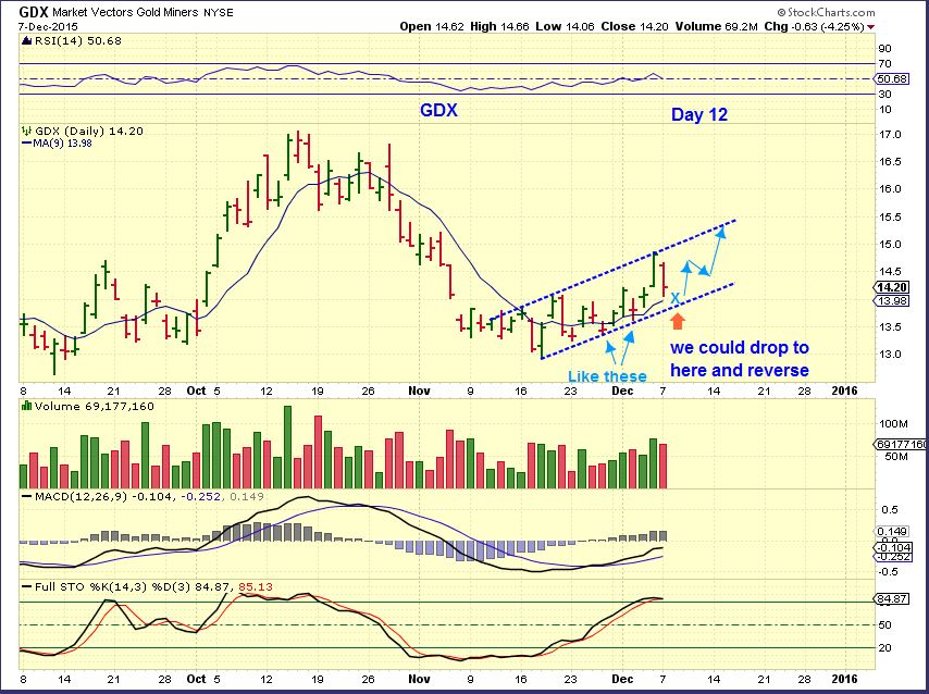 GDX – On Monday Dec 7 when the GDX dropped, some were nervous. I mentioned that the 1 day drop could just be a small 2 day drop and still have GDX moving higher. Nothing was broken yet.