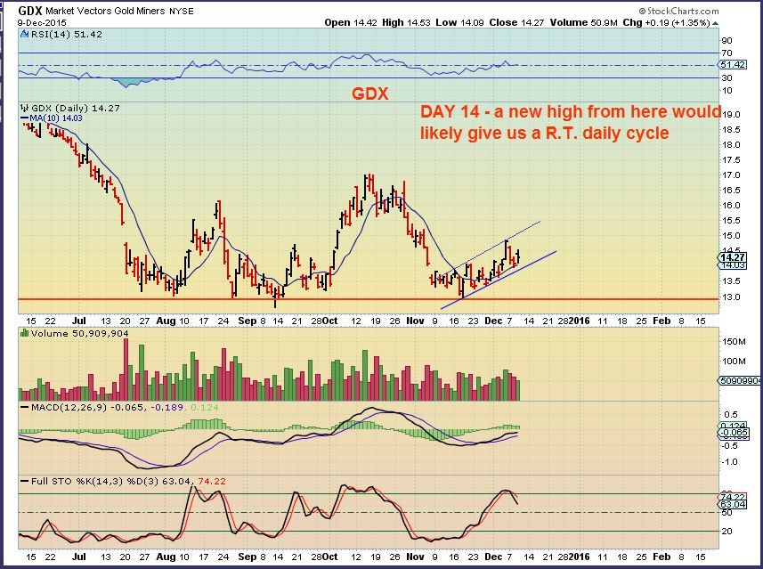 What if GDX starts to drop as the Fed day nears? Many ( Not necessarily here ) will Freak out and curse Miners apparent weakness, saying they got fooled again. They may start shorting and buying Dust. You can picture that, right? Well, I might allow myself to stop out below the 10sma if I were leveraged, but I will wait to see if we get an early DCL and not panic or go short. No emotions, just have a plan. Remember, in that scenario it is still right Translated and The 2nd daily cycle could start after the Fed day and move straight up. That would be a final shake out. This is my LESS likely scenario, but I wanted to just throw it out there in case I am away from my desk and this drop occurs ( we had a black candle Wednesday ).