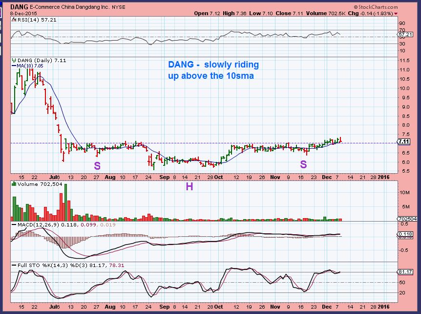 I have been pointing out DANG for weeks when it tagged the 50sma. It remains bullish and slowly rising higher on its 10sma, even with shaky markets.