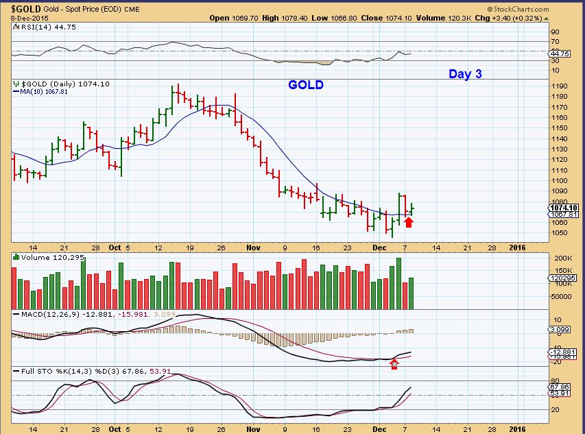 $GOLD – Gold bottomed on day 43!! Very stretched. This should be day 3 of what could be a 20 – 30day cycle, and it should start to move higher soon. Tuesday it held the 10sma. The MACD tried to cross higher while price was still dropping. So far – so good.