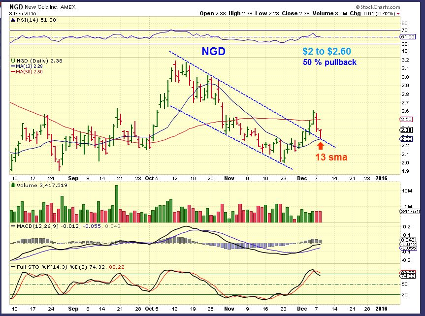 NGD – This ran up from $2.00 to $2.60 (30%) recently. Now it dropped 50% to support. NGD may still go sideways or bounce around, but I view it as a buy if it remains above support. I would think that it will run higher when Gold gets some traction.