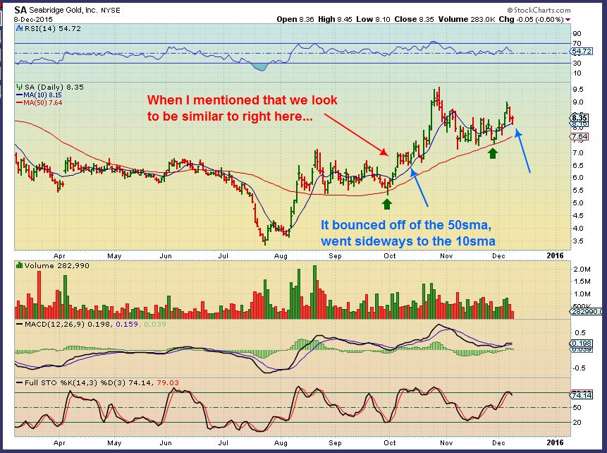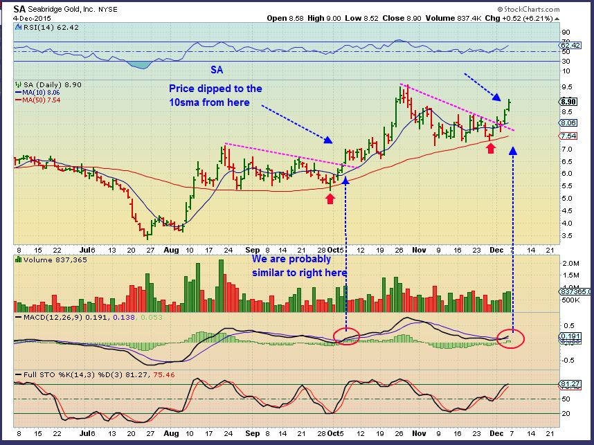 SA -After buying at the 50sma, you could add on the pull back. It may not pull back to the 50sma again at this point, so I wrote this in the last SA chart. When I pointed out that ‘we are probably similar to right here’ … I said that it then drifted to the 10sma. That could be a place to add.