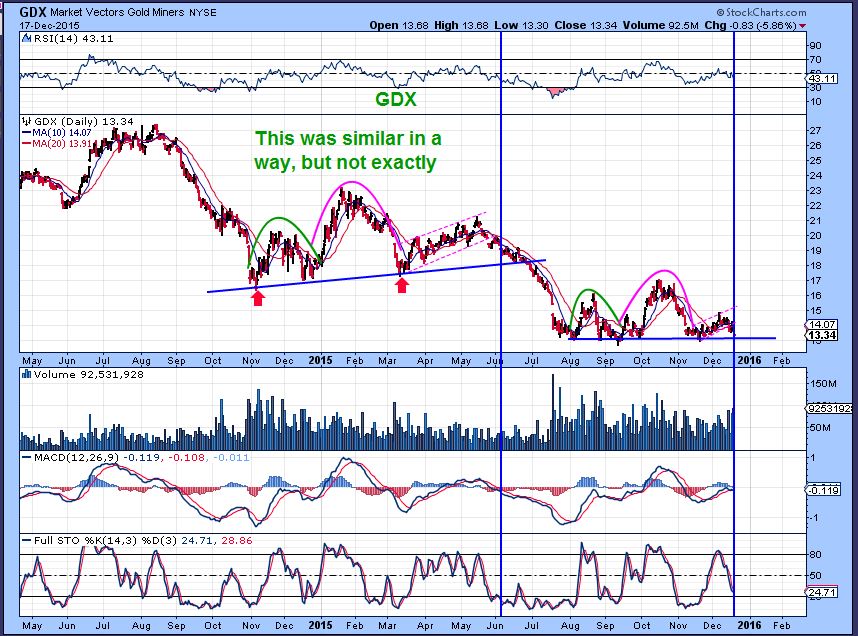 I took a step back and could see that GDX from the Nov 2014 lows through the March higher ICL look similar to now.  We see 2 monthly runs higher and then the 3rd run up was weaker and rolled over.   I’m not saying that we get the same waterfall sell off,  but lets just keep this chart in mind.