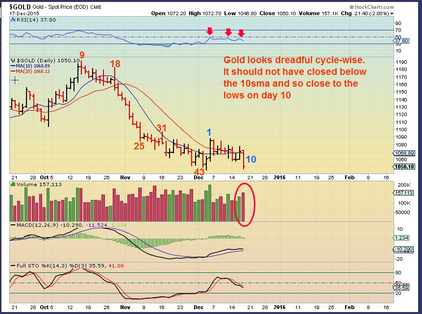 1 day later it appears that this daily cycle peaked on day 1? Gold lost it all the day after the fed. The biggest 1 day drop in months. Many Miners showed signs of breaking down, even the stronger ones. This looks like it could have 1 to even 3 weeks until a dcl.  We need a break above day 1 to get bullish, but I do not think that we will see it. The best case scenario that I can imagine is a drop and a sideways move, instead of a sell off. (  Is that $1033 area a target again?)