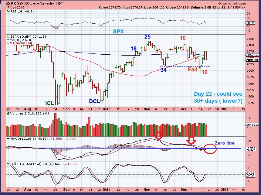 SPX – Another view. Using CYCLES, this daily cycle failed on day 19. It really should be expected that it will not go to new highs at this time. We could see 1 to 2 more weeks of weakness.
