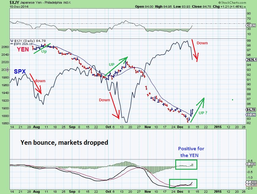 XJY – This shows its relationship with the SPX.  Yen up, SPX down.   So ff the YEN bottoms now, The Markets will probably top.